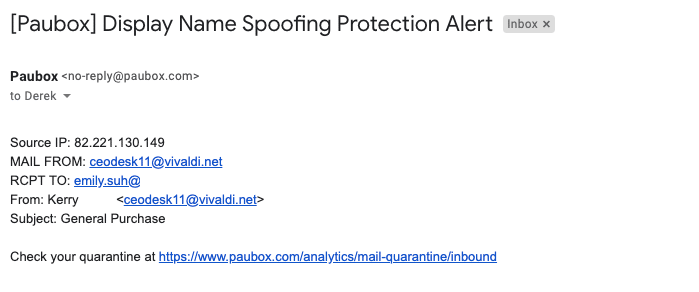 As a recap, Display Name Spoofing attacks appear to come from a person of authority (i.e. executive) within a company.