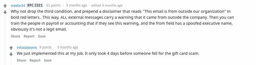 In addition, we can see from this recent Reddit thread that appending disclaimers to these phishing attacks simply does not work.