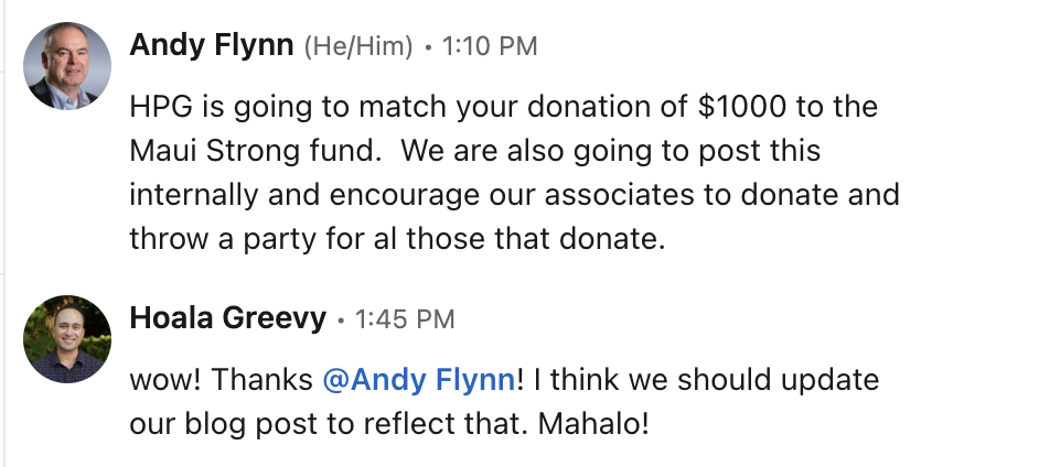 What's happening: I'm pleased to announce we've achieved our goal of matching $5,000 of donations made to the Maui Strong Fund, from both our staff and customers.