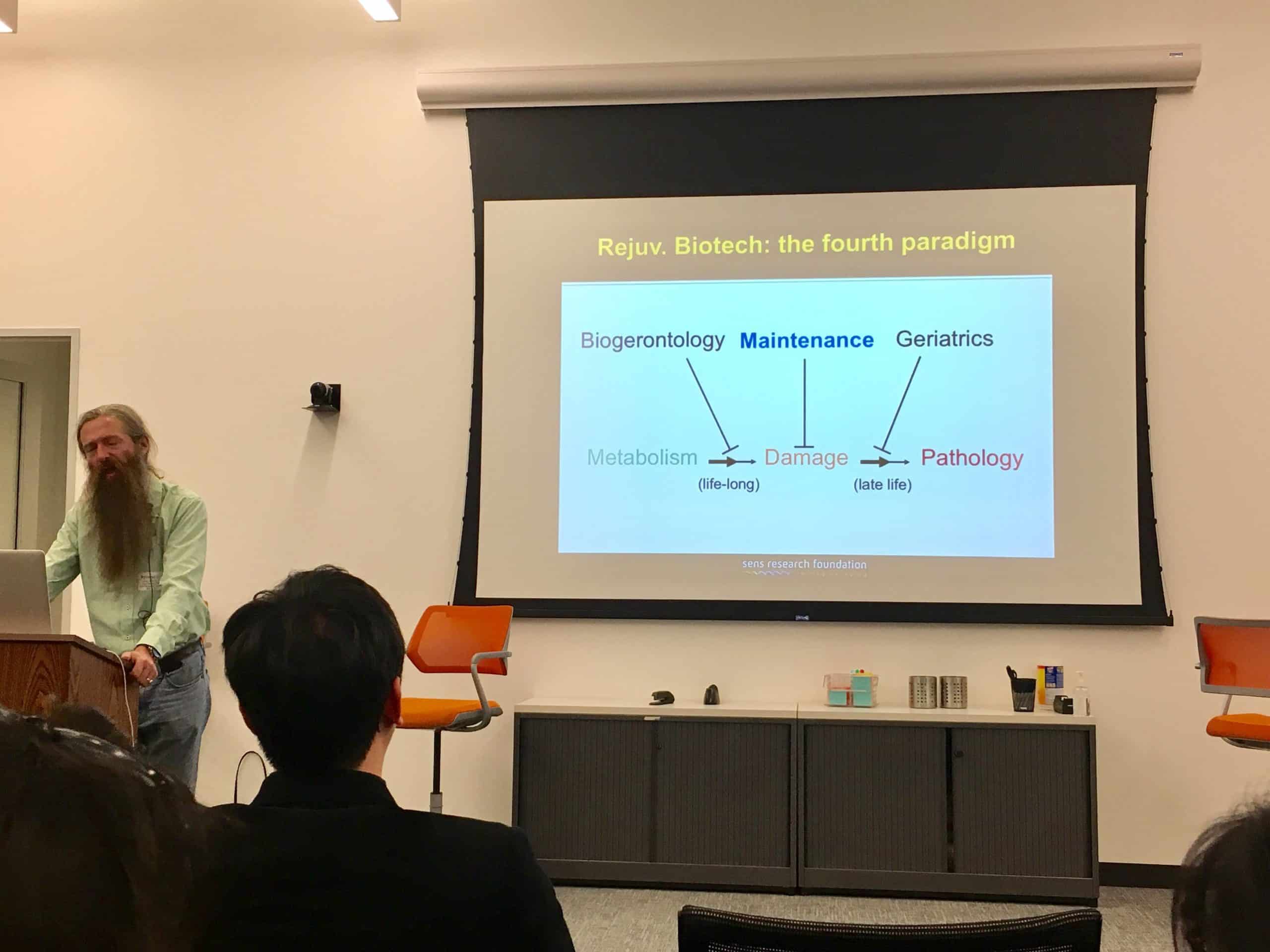 After pitches by Therachat and Quanovate, Aubrey de Grey took the mic and got down to it. Here are some notable gems and quotes I got from Dr. de Grey: