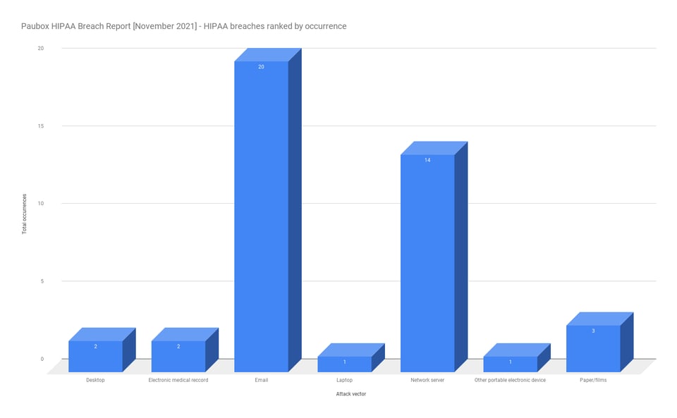- Email, network server, and other breach types were the most common attack vectors in October 2017-2021.