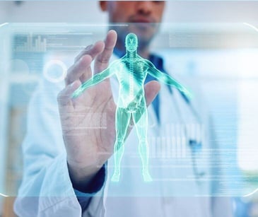 medical provider holding tablet with floating medical digital symbol