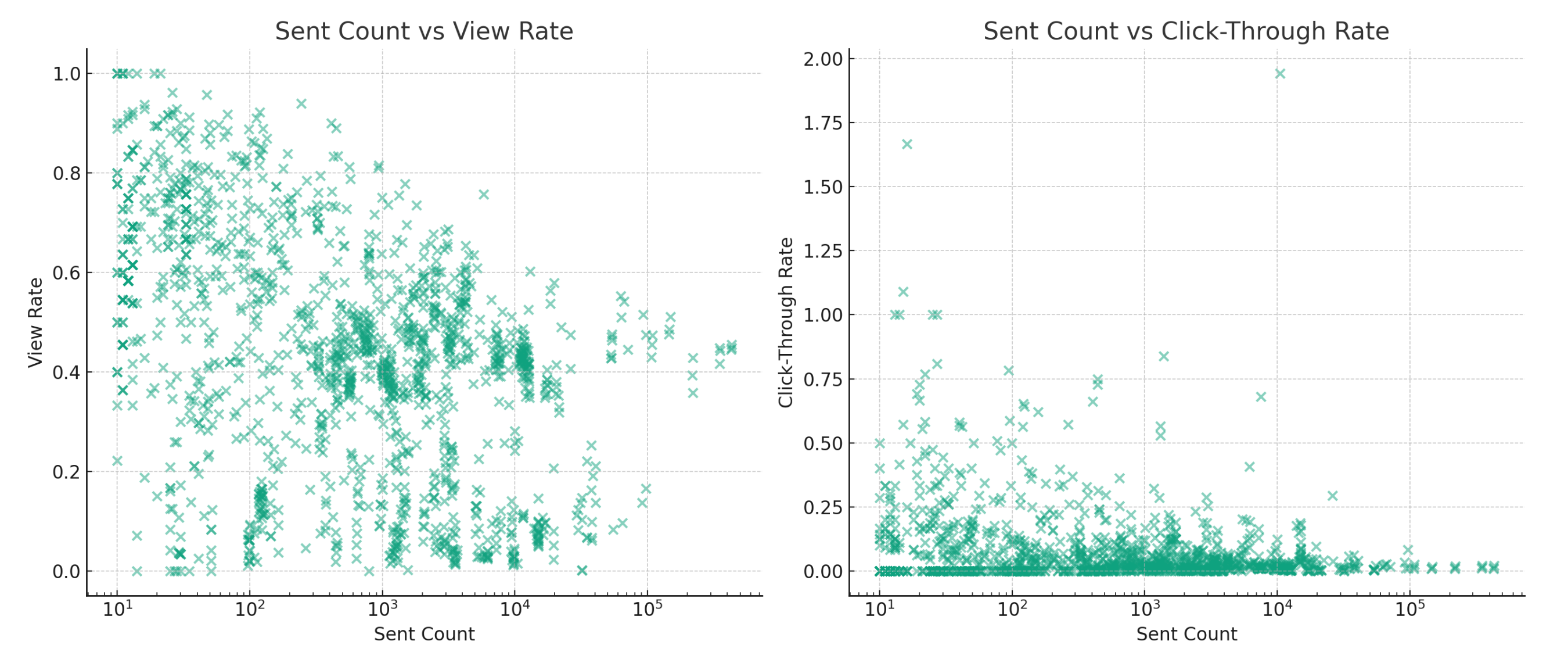 - Sent Count vs View Rate: The scatter plot shows no clear relationship between the number of recipients and the view rate, indicating that larger sends don't necessarily result in proportionally higher or lower view rates. The view rate seems somewhat independent of send size.